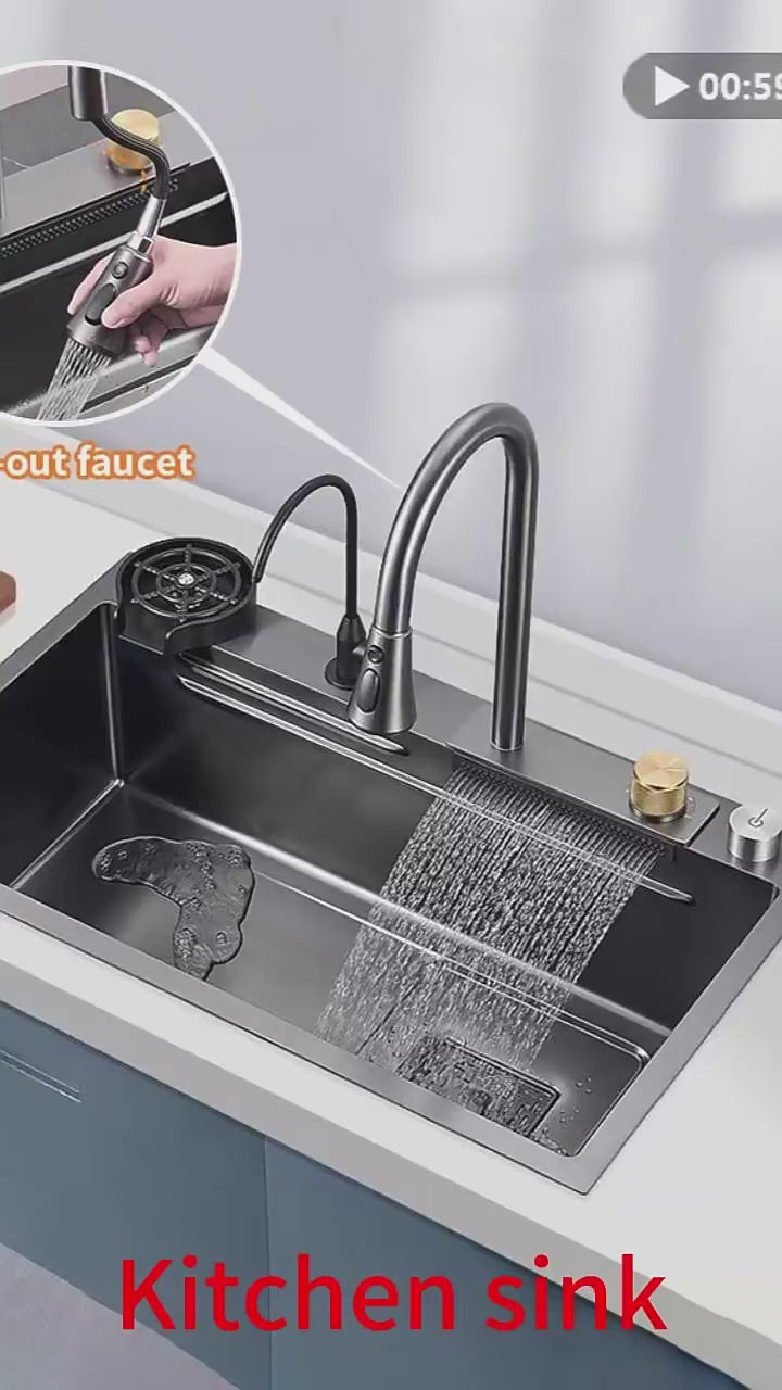 This multifunctional kitchen sink features a sleek and modern pull-out faucet with 3 water pressure settings: foam, pressure, and honeycomb. Easily switch between these settings with a control button. In addition, the sink also features a vertical falling water function with a golden knob to switch between the pull-out faucet and rainfall function. Moreover, you can control the hot and cold water temperature to suit your needs.